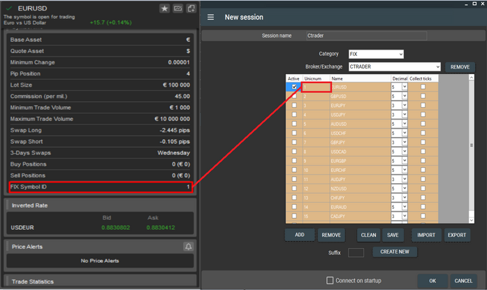 In the cTrader FIX bridge symbols are recognized by FIX Symbol ID, not by name, so it is essential to specify a correct symbol ID for each instrument in the Unicum field. You can find FIX ID in the symbol specification tab in cTrader platform.