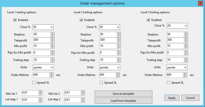 Close % - percent of trading lot to be closed on each level
