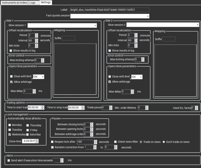 Max delay – if no updates during max delay period arbitrage signals are ignored till the next update. Used to prevent opening trades triggered by outdated quotes.