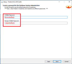 In window where it requests to put Database System Administrator password you need to type masterkey using lowercase letters to both fields and press next.