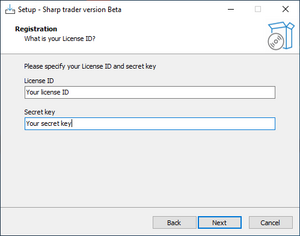 In the first window you will need to read and accept the License Agreement. In the second window it will ask you to put your License ID and Secret key. You need to put the details you received in license email. Important!!! Please make sure spelling is correct and there is no spaces before or after license ID and Secret key.