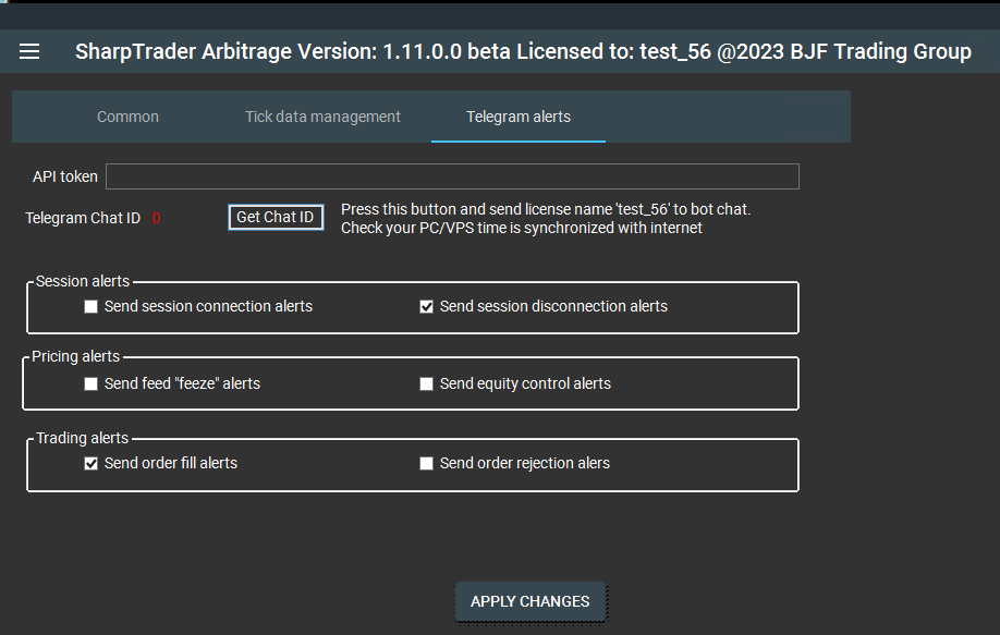 5. Copy your token, enter it into the API token field, and press the "Get Chat ID" button. Could you send your SharpTrader license ID to your bot chat?