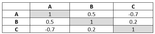 Here’s a simple example of a correlation table for three variables: A, B, and C: