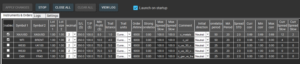 Statistical Arbitrage Strategy relies on the historically strong correlation between two financial instruments, for example, WTI and Brent, DE30 and F40, Amazon and Apple. Users can set a period for correlation determination, timeframe, and strong correlation level. The software sells strong and buys weak instruments when their correlation diverges beyond a certain level. Once mean reversion occurs, the locked position created by the two orders: buy and sell, should generally be in profit. This strategy is also known as convergence or pair trading.