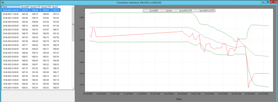 In the SharpTrader platform Spread Indicator is used to visualize the correlation between two assets. The calculation of the correlation involves the following components: