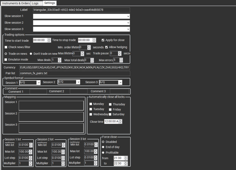 Pair list - path to FX pairs list for the triangular arbitrage rings building. You can edit the list in any text editor.