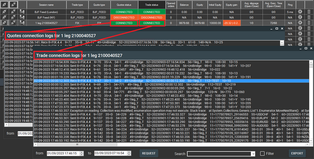 In sessions section you can get access to Quote and Trade connections logs for corresponding account by double-clicking on connection indicators. Here you can find full information about connection status and and errors.